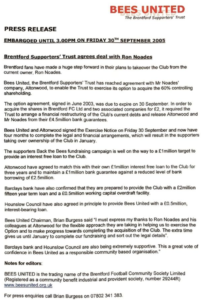 Brian approached two of the proposed ‘investor directors’ and asked if they would lend their six figure sums to the Club before the end of September ‘rather than wait until we managed to complete the takeover.’ ‘They put in £100,000 each and we went ahead and formally exercised the option. I went on the pitch before the game against Rotherham on Saturday 1st October to announce the good news. At least I thought it was good news. But when I said that two individuals who wished to remain anonymous had put in £200,000 to avoid the Club from going into administration it caused a bit of a stir.’