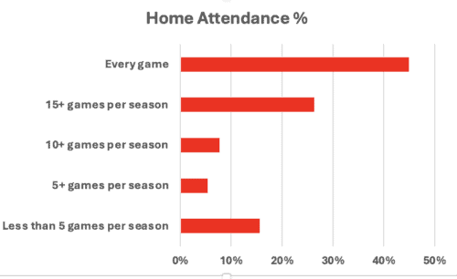 Nearly half, or 44% of you say you attend each home match and over a quarter of you will be at more than 15 games each year. You could only chose one answer.