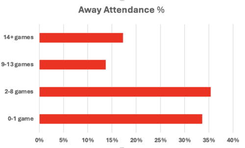 These figures reflect this season and last but as you can see, over 30% of you have been to at least 9 away games and over 35% of you are travelling more than twice.